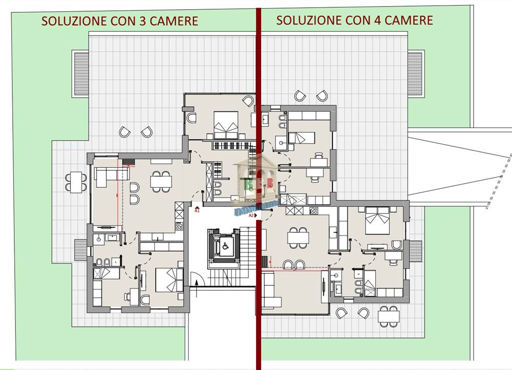 - SOLUZIONE CON 3 CAMERE oltre ad ingresso nel soggiorno con angolo cottura, doppi servizi uno dei quali in camera